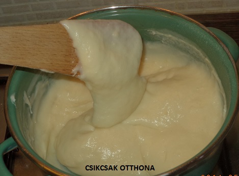 A krémhez a lisztet a tejjel és tojássárgával simára keverem, majd sűrű krémmé főzöm.