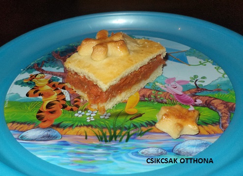 A tölteléket a tepsiben lévő tésztalapra tesszük, szépen elegyengetjük. Kinyújtjuk a másik adag tésztát is, a töltelékre borítjuk és a tetejét tojásfehérjével megkenjük.
